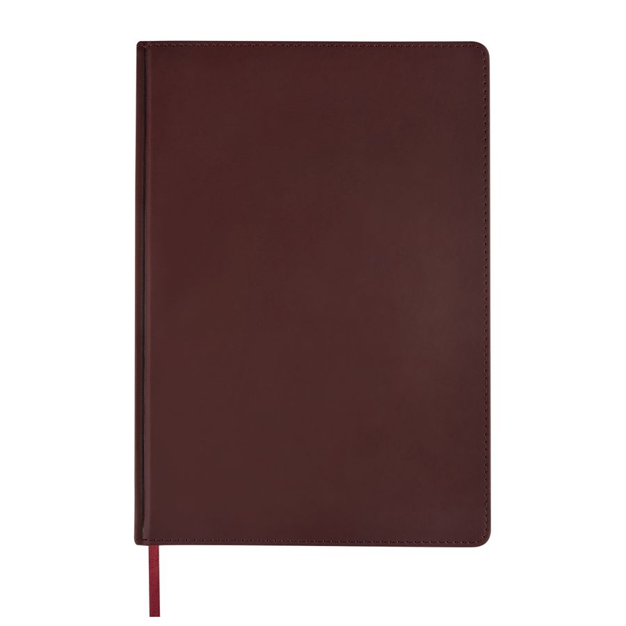 Недатированный. Бордовый цвет. Бумага 70 г белая, 272 стр., скругленный уголок, есть закладка , размер 210х300 мм. В линейку. Классический бордовый ежедневник в твердой обложке выполнен из гладкого кожзаменителя. Приятная на ощупь фактура послужит идеальной основой для тиснения. Поролонированный переплет с прошитым краем выглядит нейтрально и строго. Уголкам придана стильная закругленная форма. Модель формата А4 имеет размер 21х30 см. Внутренний блок состоит из 272 страниц первосортного белого офсета. Листы плотностью 70 г/кв.м не просвечивают чернила. Рабочие страницы в линейку дополнены указанием времени (интервал 1 час). Отсутствие датировки позволяет начать ежедневник с любого числа.Первые 14 страниц посвящены справочным данным (Телефонные коды, штрихкоды, термины международной торговли, автомобильные коды, энергетическая ценность продуктов, расход калорий, часовые пояса, аэропорты Европы, температура, единицы измерения, страны мира, римские цифры, религиозные праздники, размеры одежды, скорость, давление),а в конце есть телефонная книга с алфавитной разметкой.