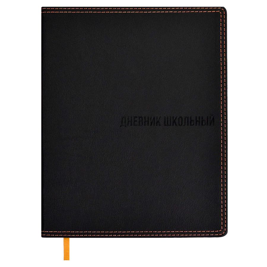 Дневник школьный арт. 67681 / 15 ЧЕРНЫЙ С ОРАНЖЕВОЙ СТРОЧКОЙ (кожзам: А5+; интегральный переплёт, материал обложки: искусственная кожа "Буйвол"; декор: блинтовое тиснение, обстрочка обложки по периметру нитками контрастного цвета; способ крепления блока: ниткошвейный; вн. блок: 48 л., белый офсет 80 г/м², печать в одну краску, справочный материал: универсальная шпаргалка; закладка: одно ляссе; форзац: печать пантоном; индивидуальная упаковка: промостикер + ПЭТ-пакет)