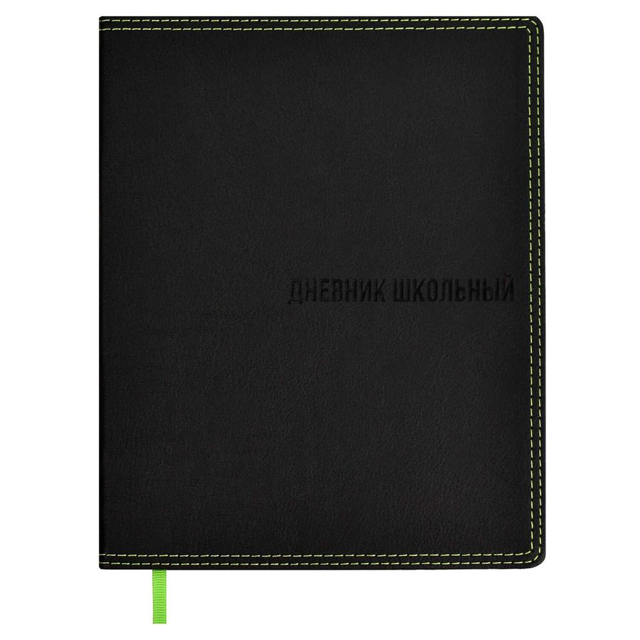 Дневник школьный арт. 67682 / 15 ЧЕРНЫЙ С САЛАТОВОЙ СТРОЧКОЙ (кожзам: А5+; интегральный переплёт, материал обложки: искусственная кожа "Буйвол"; декор: блинтовое тиснение, обстрочка обложки по периметру нитками контрастного цвета; способ крепления блока: ниткошвейный; вн. блок: 48 л., белый офсет 80 г/м², печать в одну краску, справочный материал: универсальная шпаргалка; закладка: одно ляссе; форзац: печать пантоном; индивидуальная упаковка: промостикер + ПЭТ-пакет)