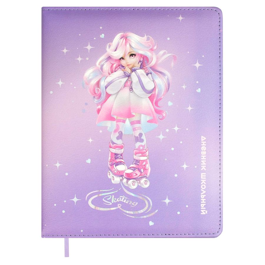 Дневник школьный арт. 68657 / 15 ДЕВОЧКА НА РОЛИКАХ (кожзам: А5+; твёрдый переплёт с поролоном, материал обложки: искусственная кожа "Наппа"; декор: печать полноцветная; способ крепления блока: ниткошвейный; вн. блок: 48 л., белый офсет 80 г/м², печать в одну краску, справочный материал: универсальная шпаргалка; закладка: одно ляссе; форзац: печать в одну краску; индивидуальная упаковка: ПЭТ-пакет)