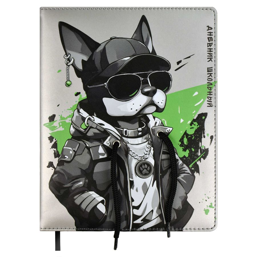 Дневник школьный арт. 68687 / 15 КРУТОЙ ПЕС (кожзам: А5+; твёрдый переплёт с поролоном, материал обложки: искусственная кожа "Софт-тач металлик"; декор: печать полноцветная, шнуровка в люверсах декоративная; способ крепления блока: ниткошвейный; вн. блок: 48 л., белый офсет 80 г/м², печать в одну краску, справочный материал: универсальная шпаргалка; закладка: одно ляссе; форзац: печать в одну краску; индивидуальная упаковка: ПЭТ-пакет)