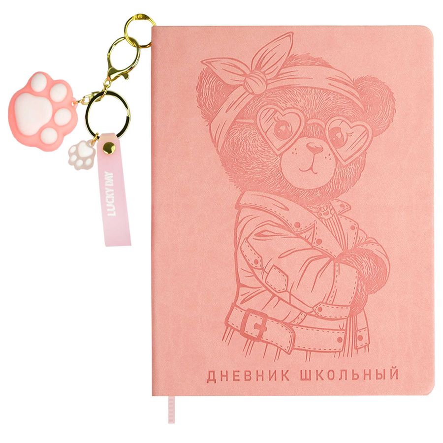 Дневник школьный арт. 68776 / 15 МИШКА В ПЛАЩЕ (кожзам: А5+; твёрдый переплёт, материал обложки: искусственная кожа "Виннер"; декор: блинтовое тиснение; способ крепления блока: ниткошвейный; вн. блок: 48 л., белый офсет 80 г/м², печать в одну краску, справочный материал: универсальная шпаргалка; отделка среза: окрашивание пантоном; закладка: одно ляссе; форзац: печать в одну краску; особенности: брелок из резины в комплекте; индивидуальная упаковка: ПЭТ-пакет)