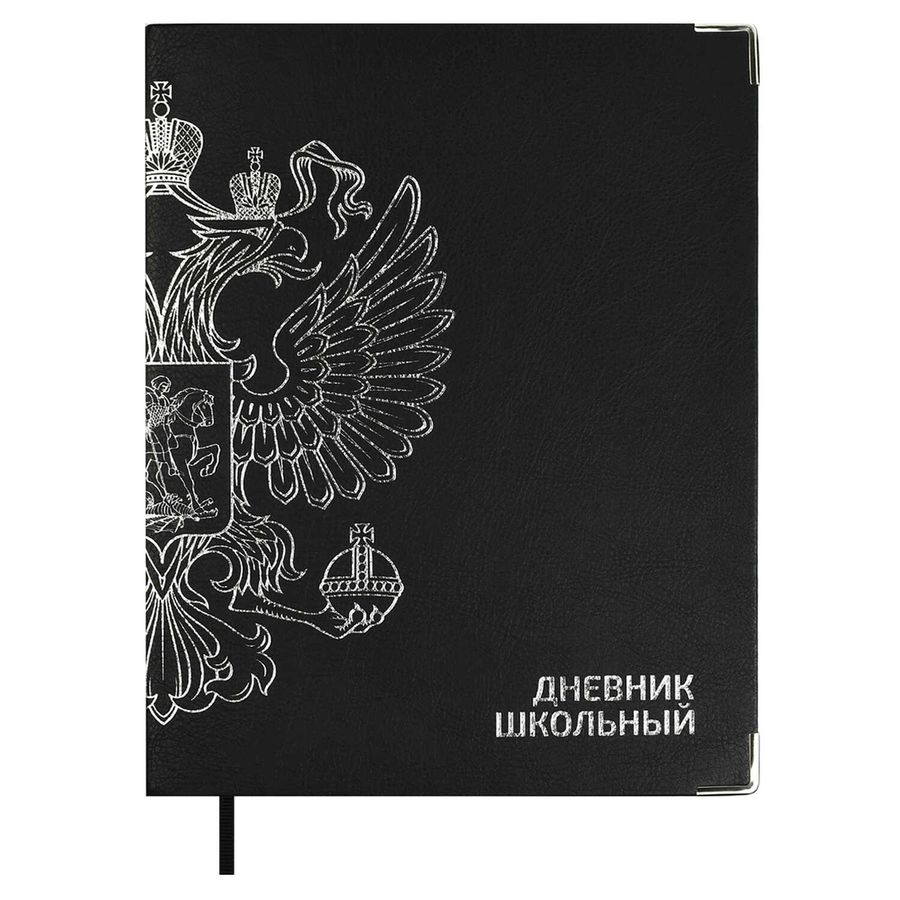 Дневник школьный арт. 68798 / 15 ГЕРБ ЧЕРНЫЙ (кожзам: А5+; интегральный переплёт, материал обложки: искусственная кожа "Наппа"; декор: тиснение фольгой; способ крепления блока: ниткошвейный; вн. блок: 48 л., белый офсет 80 г/м², печать в одну краску, справочный материал: универсальная шпаргалка; отделка среза: фольгирование; закладка: одно ляссе; форзац: печать пантоном; особенности: металлические уголки; индивидуальная упаковка: ПЭТ-пакет)