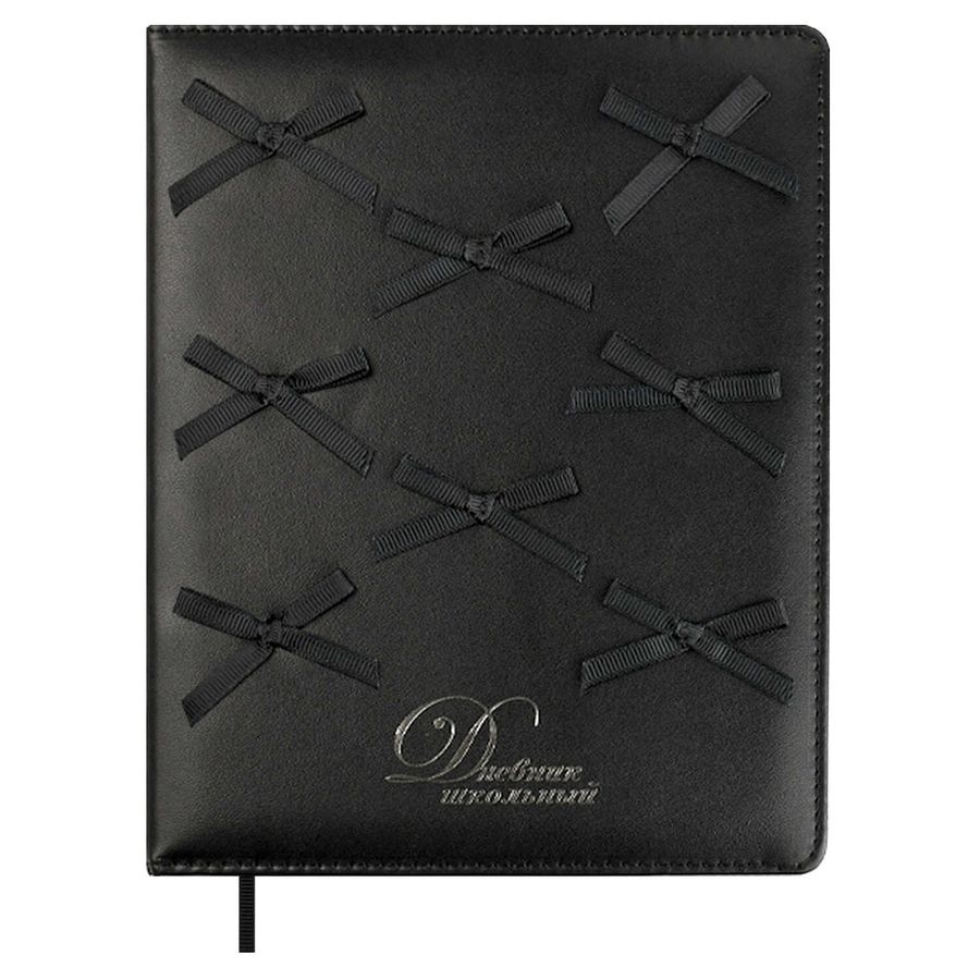 Дневник школьный арт. 70055 / 15 ЧЕРНЫЕ БАНТИКИ (кожзам: А5+; твёрдый переплёт с поролоном, материал обложки: искусственная кожа "Плонже"; декор: аппликация из полиэстера, тиснение фольгой; способ крепления блока: ниткошвейный; вн. блок: 48 л., белый офсет 80 г/м², печать в одну краску, справочный материал: универсальная шпаргалка; закладка: одно ляссе; форзац: печать в одну краску; индивидуальная упаковка: ПЭТ-пакет)