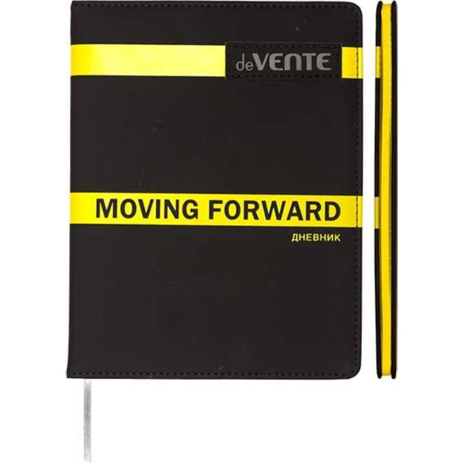 Дневник "deVENTE. Moving Forward. Yellow" универсальный блок, 48 листов, белая бумага 80 г/м² с желтым срезом, печать в 1 краску, твердая обложка из искусственной кожи, шелкография, объемная аппликация rubber patch, 1 ляссе