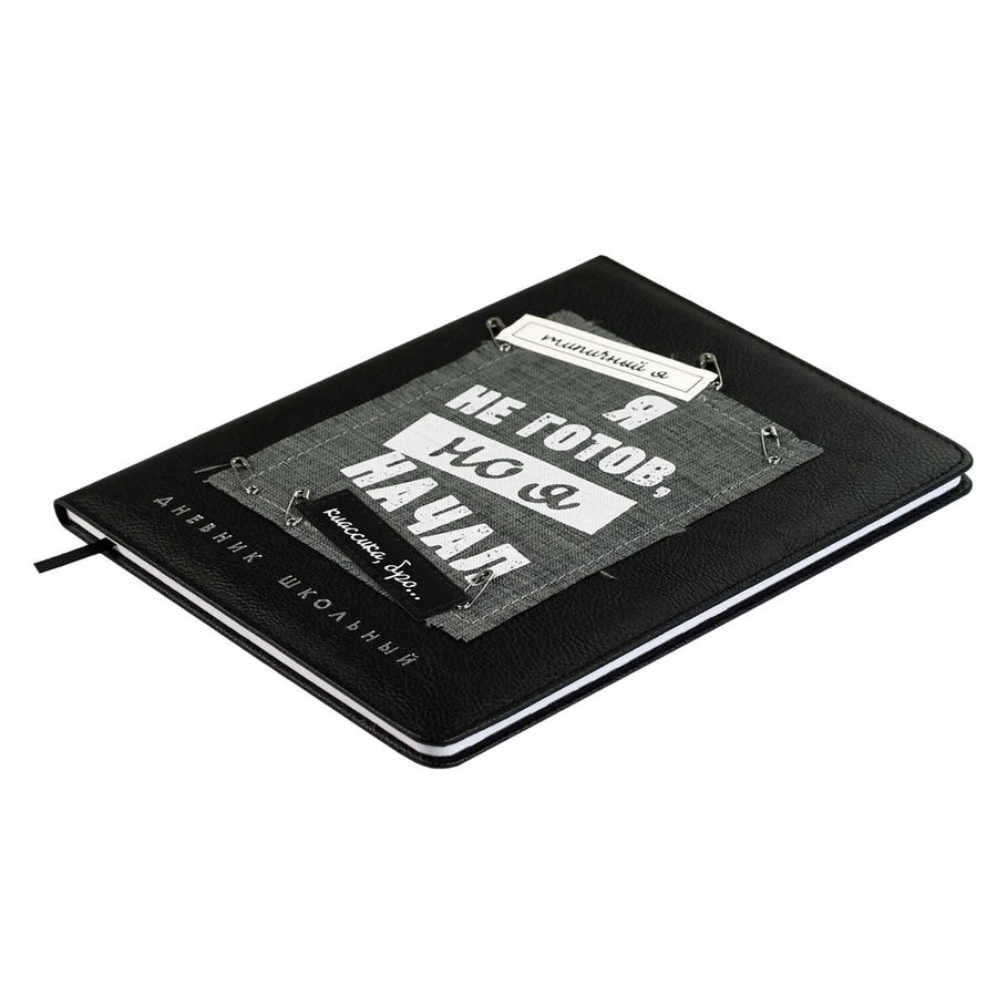Дневник школьный арт. 68688 / 15 ФРАЗЫ С ХАРАКТЕРОМ (кожзам: А5+; твёрдый переплёт с поролоном, материал обложки: искусственная кожа "Шеврет экстра"; декор: аппликация из искусственной кожи, аппликация из полиэстера, металлические булавки, печать шелкографией в одну краску, тиснение фольгой; способ крепления блока: ниткошвейный; вн. блок: 48 л., белый офсет 80 г/м², печать в одну краску, справочный материал: универсальная шпаргалка; закладка: одно ляссе; форзац: печать в одну краску; индивидуальная упаковка: ПЭТ-пакет)