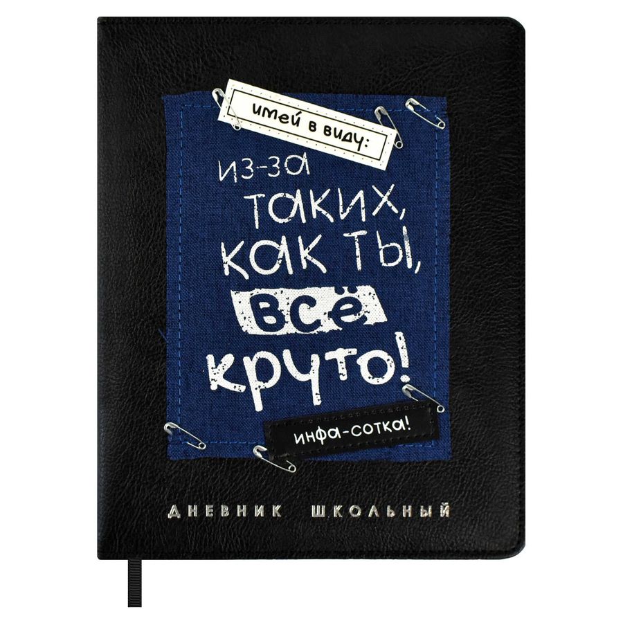Дневник школьный арт. 68689 / 15 ФРАЗЫ С ХАРАКТЕРОМ (кожзам: А5+; твёрдый переплёт с поролоном, материал обложки: искусственная кожа "Шеврет экстра"; декор: аппликация из искусственной кожи, аппликация из полиэстера, металлические булавки, печать шелкографией в одну краску, тиснение фольгой; способ крепления блока: ниткошвейный; вн. блок: 48 л., белый офсет 80 г/м², печать в одну краску, справочный материал: универсальная шпаргалка; закладка: одно ляссе; форзац: печать в одну краску; индивидуальная упаковка: ПЭТ-пакет)
