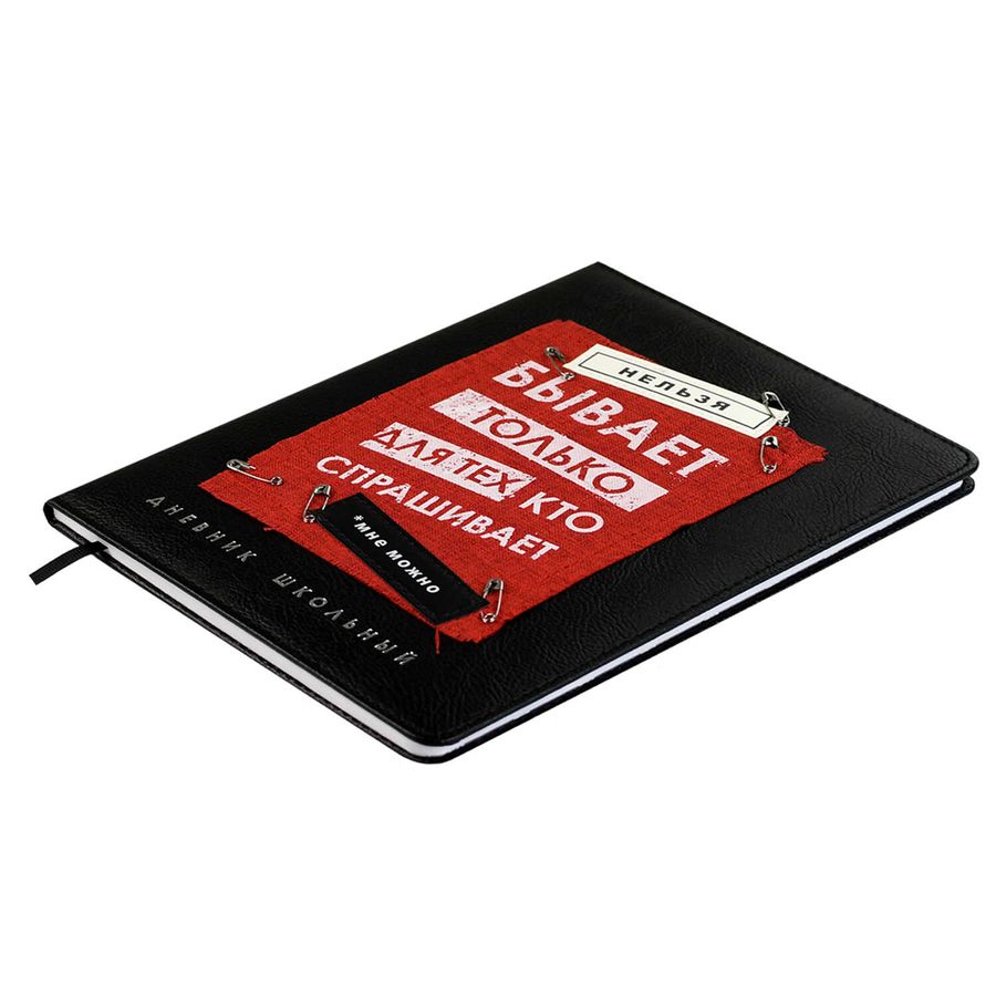 Дневник школьный арт. 68690 / 15 ФРАЗЫ С ХАРАКТЕРОМ (кожзам: А5+; твёрдый переплёт с поролоном, материал обложки: искусственная кожа "Шеврет экстра"; декор: аппликация из искусственной кожи, аппликация из полиэстера, металлические булавки, печать шелкографией в одну краску, тиснение фольгой; способ крепления блока: ниткошвейный; вн. блок: 48 л., белый офсет 80 г/м², печать в одну краску, справочный материал: универсальная шпаргалка; закладка: одно ляссе; форзац: печать в одну краску; индивидуальная упаковка: ПЭТ-пакет)