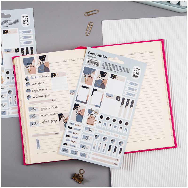 Бумажные наклейки для ежедневников MESHU Strict lines – отличный помощник в креативном оформлении записей в блокнотах и дневниках. Наклейки выполнены в стильном и трендовом дизайне. Лист с наклейками представлен в размере 12*21 см. В упаковке 40-60 наклеек, изготовленных из самоклеящейся бумаги. Бумажные наклейки подойдут также для украшения канцтоваров, открыток, поделок, телефонов, ноутбуков, предметов интерьера. Яркие современные дизайны от MESHU сделают творческий процесс увлекательным и подарят отличное настроение. Наклейки представлены с европодвесом. Размер листа: 120*210 мм; Количество наклеек: 40-60