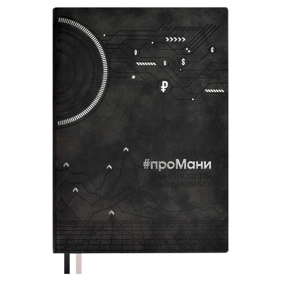 Ежедневник недатированный ESCALADA, #проМани, А5, 160 л., арт. 64002/ 15 ТИВОЛИ ЧЁРНЫЙ (кожзам: 146x211 мм, мягкий переплёт, запаянный край, материал обложки: искусственная кожа "Тиволи"; способ крепления блока: ниткошвейный; декор: тиснение фольгой, блинтовое тиснение; вн. блок: 160 л., кремовый офсет 70 г/м², печать в одну краску (линия), справочный материал: есть; перфорация углов блока: нет; закладка/-и: два ляссе, каптал: есть; форзац: печать пантоном, особенности: в блоке использованы авторские разработки на тему финансовой грамотности и ведения личного бюджета от Анастасии Грейджук – финансового блогера, эксперта и коуча; персонализация возможна: нет; индивидуальная упаковка: промостикер + ПЭТ-пакет)