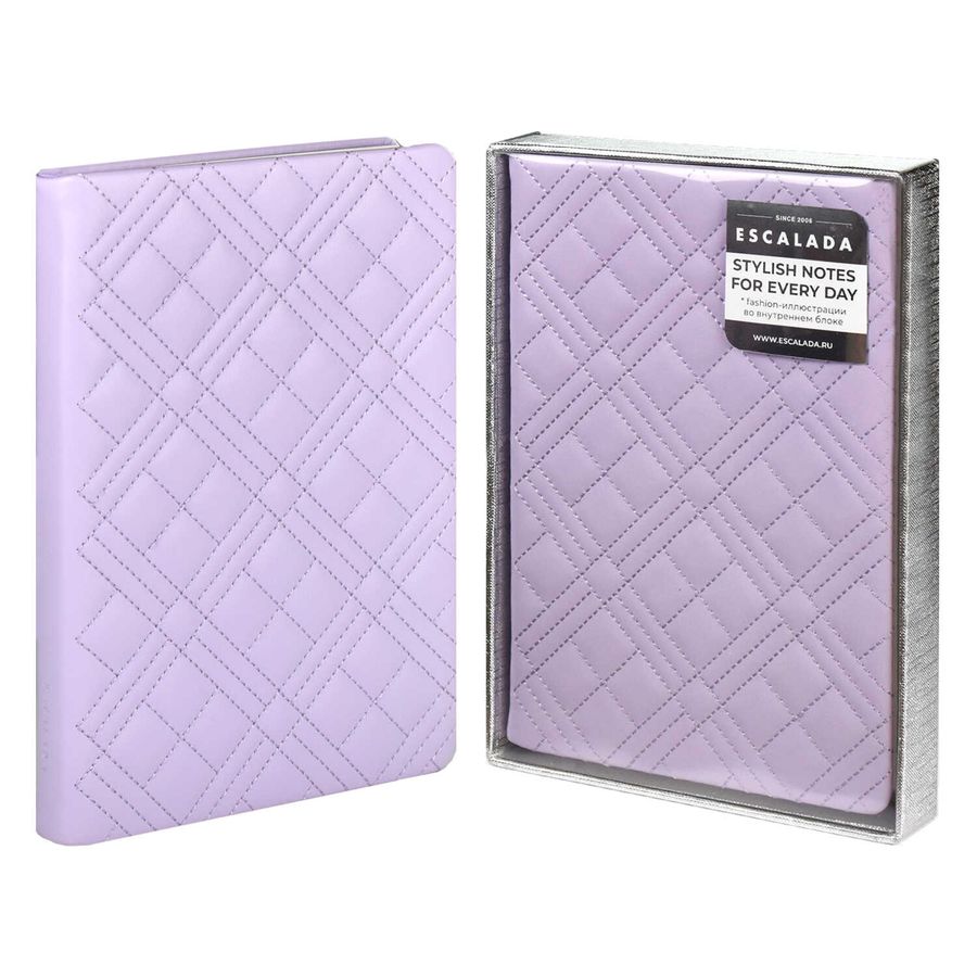 Ежедневник недатированный ESCALADA, INSPIRED BY FASHION, А5, 164 л., арт. 63967/ 15 ЛАЙКА СИРЕНЕВЫЙ (кожзам: 146х211 мм, твёрдый переплёт с поролоном, материал обложки: искусственная кожа "Лайка"; способ крепления блока: ниткошвейный; декор: стёганая строчка; вн. блок: 164 л., кремовый офсет 70 г/м², печать в одну краску (линия), справочный материал: есть; перфорация углов блока: нет; закладка/-и: одно ляссе, каптал: есть; форзац: печать пантоном, особенности: 4 листа иллюстраций с высказываниями на полупрозрачной кальке; персонализация возможна: нет; индивидуальная упаковка: подарочная картонная коробка с ПВХ-крышкой + промостикер + ПЭТ-пакет)