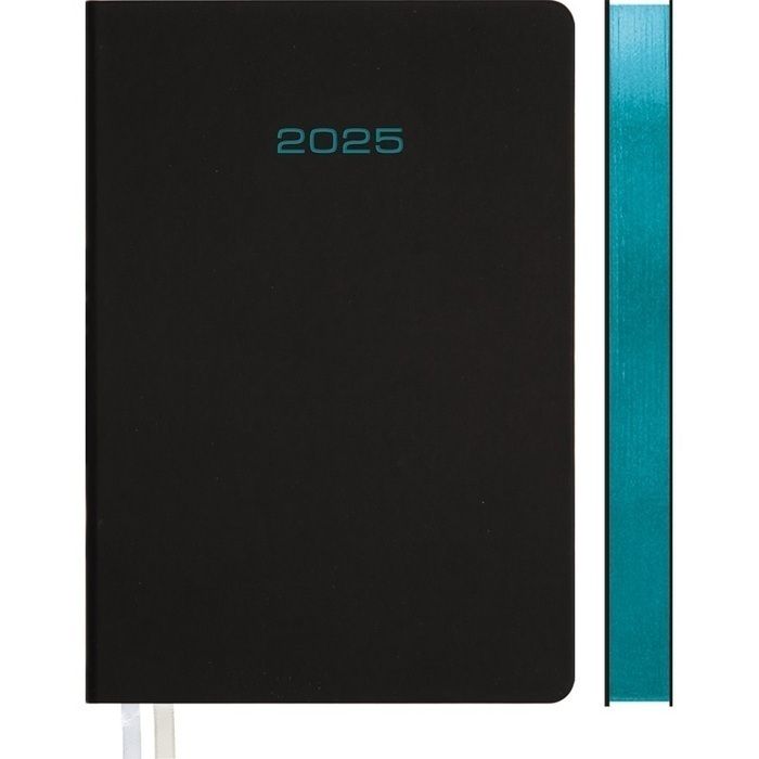 Ежедневник датированный 2025 "deVENTE. Duo" A5 (145 ммx205 мм) 336 стр, белая бумага 70 г/м² с голубым срезом, печать в 2 краски, твердая обложка из искусственной кожи, шелкография, голубой форзац, перфорация, закругленные уголки, 2 ляссе, в термоусадочной пленке, черный с голубым.