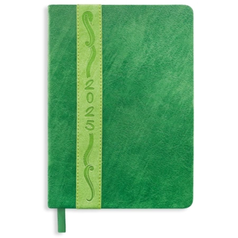 Ежедневник 2025 А5 148*210мм искуственная кожа " Альфа-Тренд " 176л Марсель зеленый/светло-зеленый, линия, белый офсет 80г/м2, печать в 2 краски, апликация- полоса, блинтовое тиснение, закругленные уголки, подходит под теснение, 1 ляссе, пакет