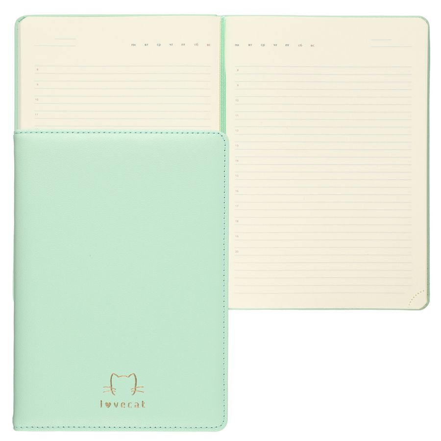 Ежедневник недатированный "deVENTE. I Love Cat!" A5 (145 ммx205 мм) 272 стр, кремовая бумага 70 г/м², печать в 2 краски, твердая обложка из искусственной кожи с поролоном, тиснение фольгой, отстрочка, перфорация, закругленные уголки, 2 ляссе, в термоусадочной пленке, мятный