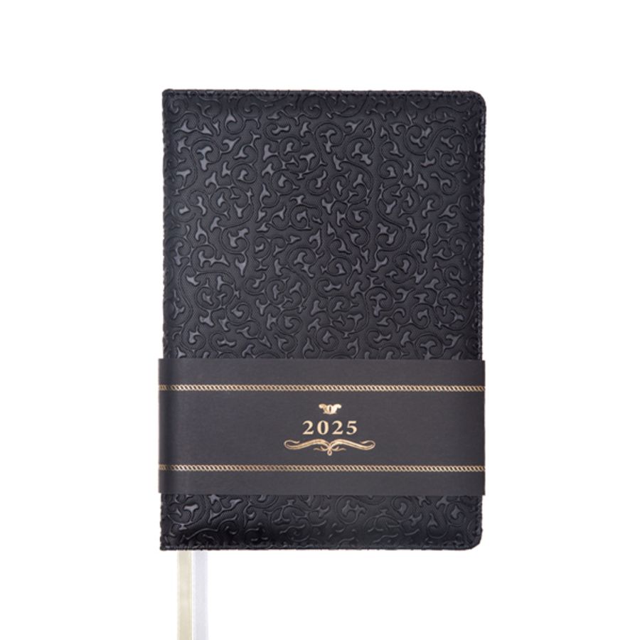 Ежедневник недатированный "deVENTE. Arcadia" A5 (145 ммx205 мм) 272 стр, белая бумага 70 г/м², печать в 2 краски, твердая обложка из искусственной кожи с поролоном, отстрочка, перфорация, закругленные уголки, 2 ляссе, в термоусадочной пленке, черный с черным паттерном