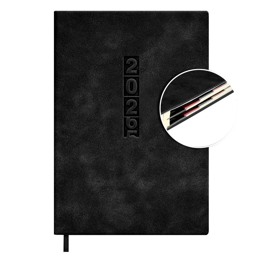Ежедневник датированный 2026 ESCALADA, #ДУМАЙ КАК МИЛЛИАРДЕР, А5, 176 л., арт. 70269/ 15 ТИВОЛИ ГЛОСС ЧЁРНЫЙ (кожзам: 146x211 мм, мягкий переплёт, запаянный край, материал обложки: искусственная кожа "Тиволи глосс"; декор: блинтовое тиснение; способ крепления блока: ниткошвейный; вн. блок: 176 л., кремовый офсет 70 г/м², печать в две краски (линия), справочный материал: есть; перфорация углов блока: есть; закладка/-и: одно ляссе; каптал: есть; форзац: печать пантоном; особенности: в блоке использованы мотивирующие высказывания из книги "Думай как миллиардер", помогающие сформировать правильное отношение к финансам, профессиональной деятельности, своим способностям и к жизни в целом, вырубка блока по месяцам; персонализация возможна: да; индивидуальная упаковка: промостикер + ПЭТ-пакет)