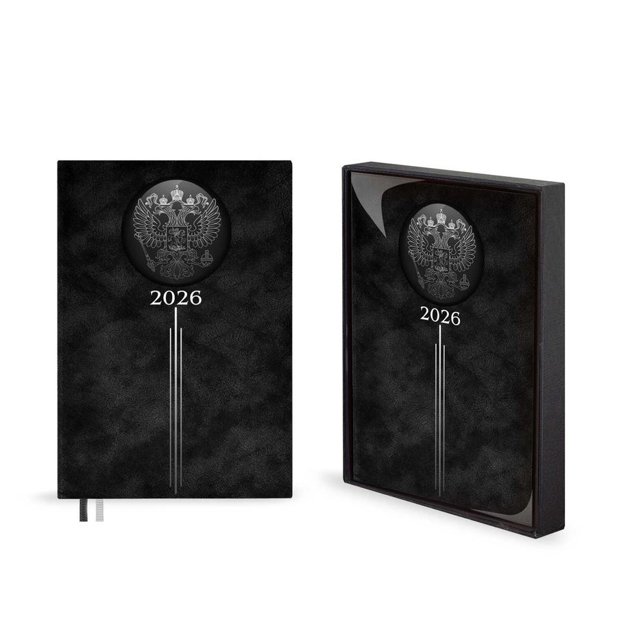 Ежедневник датированный 2026 ESCALADA, А5, 176 л., арт. 70249/ 10 ТИВОЛИ ЧЁРНЫЙ (кожзам: 146x211 мм, твёрдый переплёт, запаянный край, материал обложки: искусственная кожа "Тиволи"; декор: 3D-дизайн, тиснение фольгой; способ крепления блока: ниткошвейный; вн. блок: 176 л., кремовый офсет 70 г/м², печать в две краски (линия), справочный материал: есть; перфорация углов блока: нет; отделка среза: фольгирование; закладка/-и: два ляссе; каптал: есть; форзац: печать пантоном; персонализация возможна: да; индивидуальная упаковка: промостикер + подарочная картонная коробка с ПВХ-крышкой + ПЭТ-пакет)