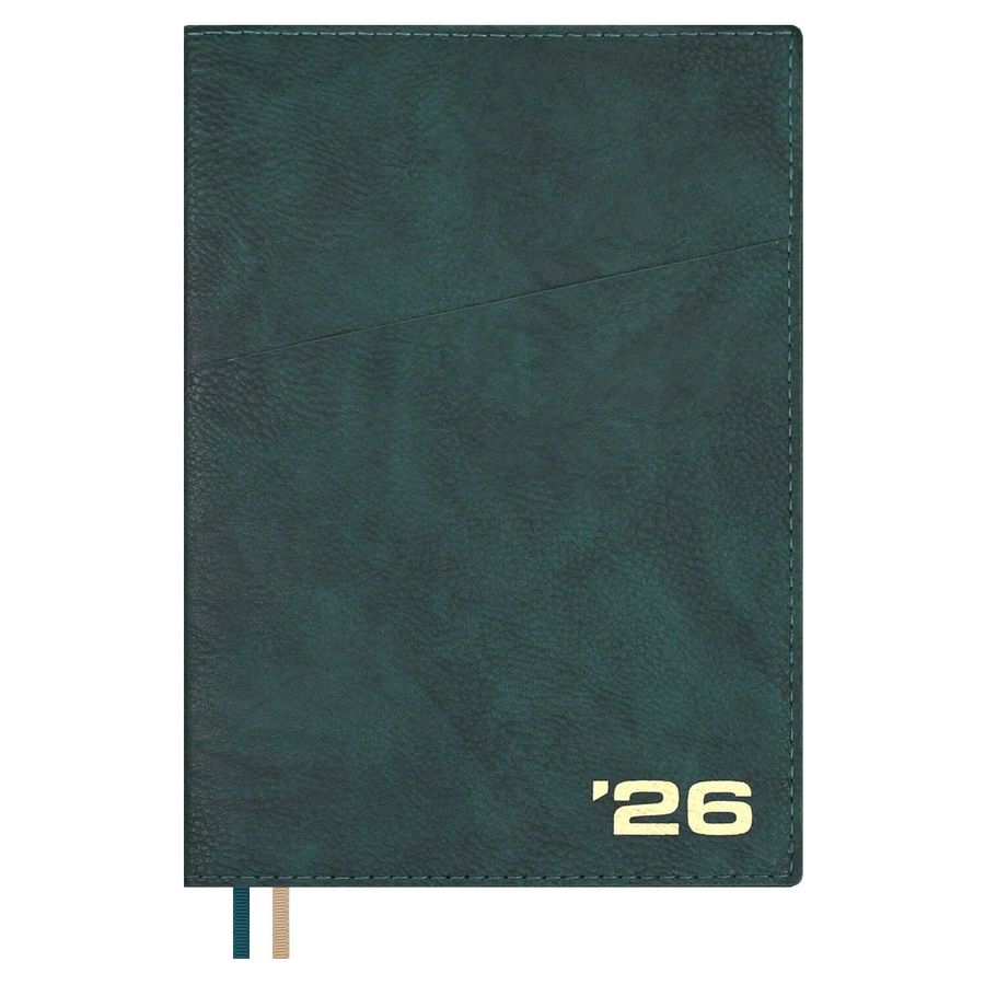 Ежедневник датированный 2026 ESCALADA, А5+, 176 л., арт. 70406/ 10 ШЕВРЕТ ЗЕЛЁНЫЙ (кожзам: 175x245 мм, запаянный край, интегральный переплёт, материал обложки: искусственная кожа "Шеврет"; декор: тиснение фольгой; способ крепления блока: ниткошвейный; вн. блок: 176 л., кремовый офсет 80 г/м², печать в две краски (клетка), справочный материал: есть; перфорация углов блока: есть; закладка/-и: два ляссе; каптал: есть; форзац: печать пантоном; особенности: карман функциональный как часть обложки; персонализация возможна: да; индивидуальная упаковка: ПЭТ-пакет)