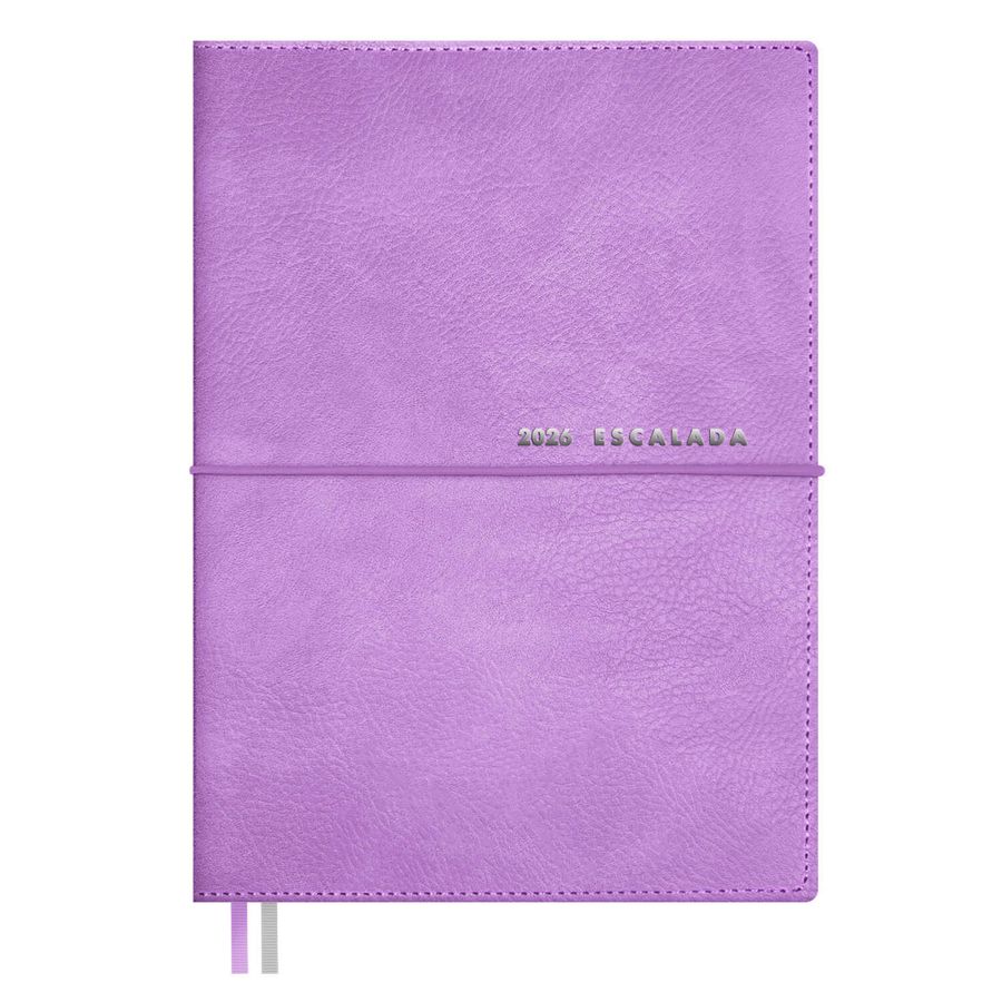 Ежедневник датированный 2026 ESCALADA, А6+, 128 л., арт. 70312/ 20 ШЕВРЕТ СИРЕНЕВЫЙ (кожзам: 128х176 мм, мягкий переплёт, запаянный край, съёмная обложка, материал обложки: искусственная кожа "Шеврет"; декор: тиснение фольгой; способ крепления блока: вставной блок, ниткошвейный; вн. блок: 128 л., кремовый офсет 70 г/м², печать в две краски (линия), справочный материал: есть; перфорация углов блока: нет; закладка/-и: два ляссе; каптал: нет; форзац: печать пантоном; особенности: застёжка-резинка, закладка пластиковая, украшенная тиснением фольгой, в комплекте; персонализация возможна: да; индивидуальная упаковка: промостикер + ПЭТ-пакет)