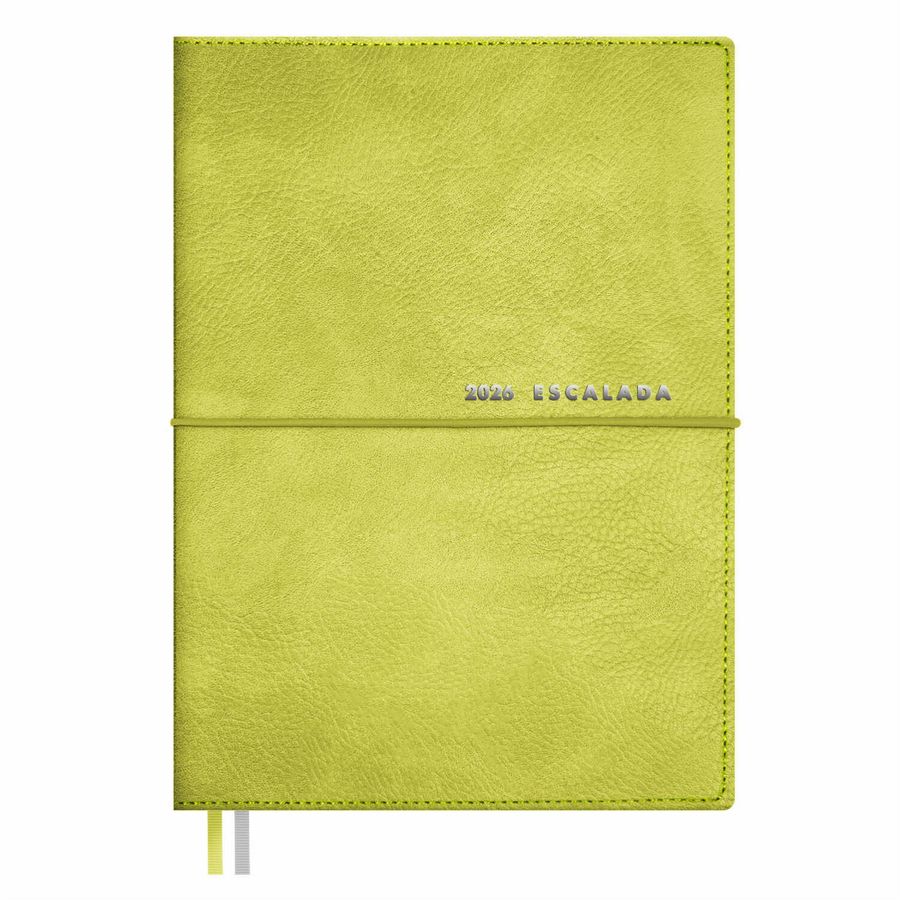 Ежедневник датированный 2026 ESCALADA, А6+, 128 л., арт. 70313/ 20 ШЕВРЕТ ОЛИВКОВЫЙ (кожзам: 128х176 мм, мягкий переплёт, запаянный край, съёмная обложка, материал обложки: искусственная кожа "Шеврет"; декор: тиснение фольгой; способ крепления блока: вставной блок, ниткошвейный; вн. блок: 128 л., кремовый офсет 70 г/м², печать в две краски (линия), справочный материал: есть; перфорация углов блока: нет; закладка/-и: два ляссе; каптал: нет; форзац: печать пантоном; особенности: застёжка-резинка, закладка пластиковая, украшенная тиснением фольгой, в комплекте; персонализация возможна: да; индивидуальная упаковка: промостикер + ПЭТ-пакет)