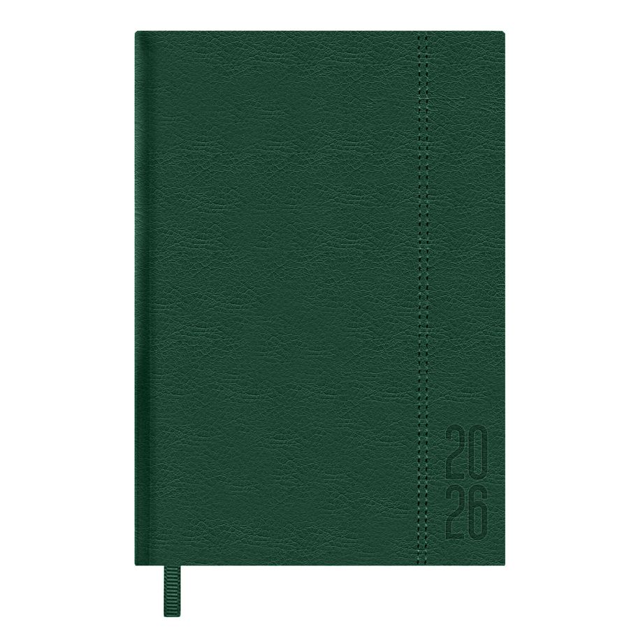 Ежедневник датированный 2026 ESCALADA, А6+, 176 л., арт. 70287/ 20 НАППА ТЁМНО-ЗЕЛЁНЫЙ (кожзам: 126х174 мм, твёрдый переплёт с поролоном, материал обложки: искусственная кожа "Наппа"; декор: блинтовое тиснение, отделочная строчка; способ крепления блока: ниткошвейный; вн. блок: 176 л., белый офсет 70 г/м², печать в одну краску (линия), справочный материал: есть; перфорация углов блока: нет; закладка/-и: одно ляссе; каптал: есть; форзац: без печати; персонализация возможна: да; индивидуальная упаковка: ПЭТ-пакет)