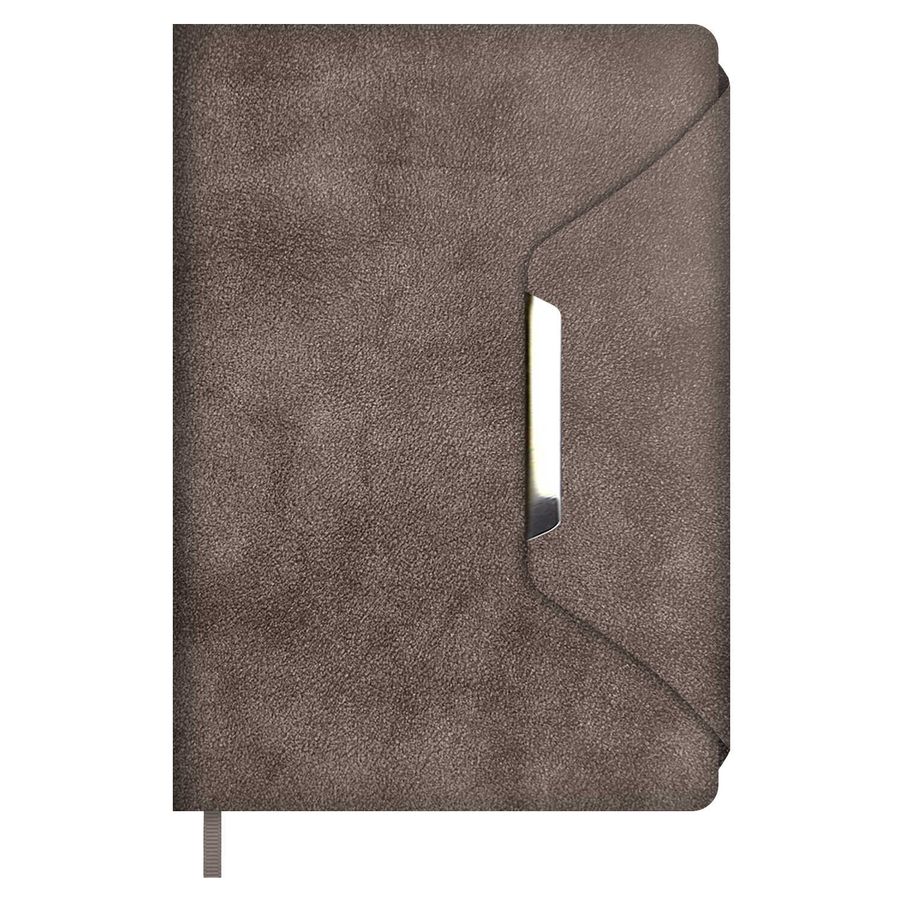 Ежедневник недатированный ESCALADA, А5, 160 л., арт. 70609/ 15 СПИЛОК ДЕЛАВЭ СЕРО-КОРИЧНЕВЫЙ (кожзам: 146x211 мм, твёрдый переплёт, запаянный край, материал обложки: искусственная кожа "Спилок делавэ"; способ крепления блока: ниткошвейный; декор: металлический шильд; вн. блок: 160 л., кремовый офсет 70 г/м², печать в одну краску (линия), справочный материал: есть; перфорация углов блока: нет; отделка среза: фольгирование; закладка/-и: одно ляссе, каптал: есть; форзац: печать пантоном, тиснение фольгой, особенности: магнитный клапан; персонализация возможна: да; индивидуальная упаковка: ПЭТ-пакет)