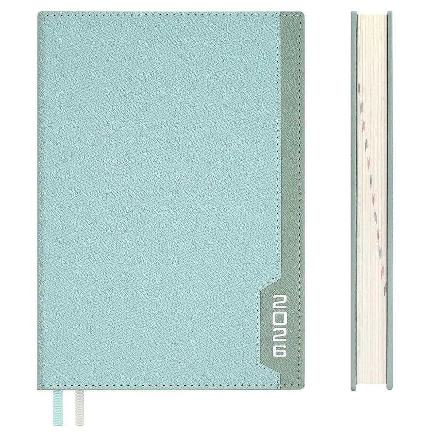 Ежедневник датированный 2026 ESCALADA, #ДУМАЙ КАК МИЛЛИАРДЕР, А5, 176 л., арт. 70237/ 15 ДЖУТ МЯТНЫЙ (кожзам: 146x211 мм, твёрдый переплёт, запаянный край, материал обложки: искусственная кожа "Джут"; декор: тиснение фольгой; способ крепления блока: ниткошвейный; вн. блок: 176 л., кремовый офсет 70 г/м², печать в две краски (линия), справочный материал: есть; перфорация углов блока: нет; закладка/-и: два ляссе; каптал: есть; форзац: печать пантоном; особенности: в блоке использованы мотивирующие высказывания из книги "Думай как миллиардер", помогающие сформировать правильное отношение к финансам, профессиональной деятельности, своим способностям и к жизни в целом, комбинированные материалы; персонализация возможна: да; индивидуальная упаковка: промостикер + ПЭТ-пакет)
