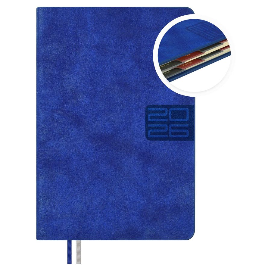 Ежедневник датированный 2026 ESCALADA, #ДУМАЙ КАК МИЛЛИАРДЕР, А6+, 176 л., арт. 70292/ 20 ТИВОЛИ ГЛОСС СИНИЙ (кожзам: 126x174 мм, твёрдый переплёт, запаянный край, материал обложки: искусственная кожа "Тиволи глосс"; декор: блинтовое тиснение; способ крепления блока: ниткошвейный; вн. блок: 176 л., тонированный офсет 70 г/м², печать в две краски (линия), справочный материал: есть; перфорация углов блока: есть; закладка/-и: два ляссе; каптал: есть; форзац: печать пантоном; особенности: вырубка блока по месяцам, в блоке использованы мотивирующие высказывания экстраординарной личности, предпринимателя и миллиардера, титулованного «Провидца века», шоумена и телеведущего, бывшего владельца конкурса красоты «Мисс Вселенная» и дважды президента США – Дональда Трампа; персонализация возможна: да; индивидуальная упаковка: промостикер + ПЭТ-пакет)
