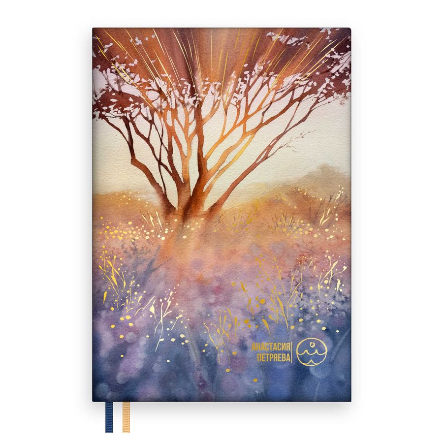 Ежедневник недатированный ESCALADA, #АФФИРМАЦИИ, А5, 160 л., арт. 70658/ 15 СВЕТ СКВОЗЬ ВЕТВИ (кожзам: 146х211 мм, мягкий переплёт, запаянный край, материал обложки: искусственная кожа "Наппа"; способ крепления блока: ниткошвейный; декор: тиснение фольгой, блинтовое тиснение; вн. блок: 160 л., кремовый офсет 70 г/м², печать в две краски (линия), справочный материал: есть; перфорация углов блока: нет; отделка среза: окрашивание пантоном; закладка/-и: два ляссе, каптал: есть; форзац: печать в одну краску, особенности: в блоке на каждой странице прописаны аффирмации – положительные установки, которые позволяют настроиться на положительные эмоции и мысли, достичь гармонии с собой, изменить свою жизнь, на обложке ежедневника представлены живописные работы талантливого художника-акварелиста, автора обучающих видеокурсов по акварельной технике, пользующихся популярностью и переведенных на несколько языков, – Анастасии Петряевой; персонализация возможна: да; индивидуальная упаковка: промостикер + ПЭТ-пакет)