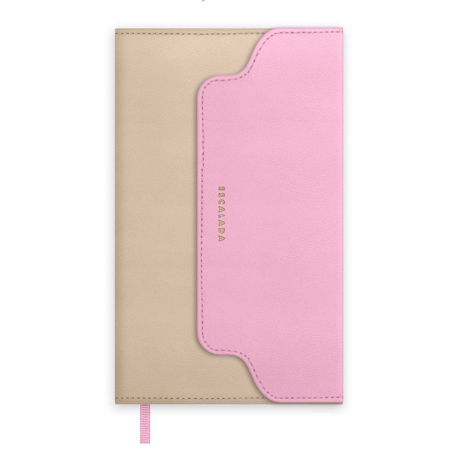 Ежедневник недатированный ESCALADA, А6+, 120 л., арт. 70674/ 20 ПЛЕЗИР БЕЖЕВЫЙ/РОЗОВЫЙ (кожзам: 110x190 мм, твёрдый переплёт, запаянный край, материал обложки: искусственная кожа "Плезир"; способ крепления блока: ниткошвейный; декор: тиснение фольгой; вн. блок: 120 л., кремовый офсет 70 г/м², печать в одну краску (линия), справочный материал: есть; перфорация углов блока: нет; отделка среза: окрашивание пантоном; закладка/-и: одно ляссе, каптал: есть; форзац: печать пантоном, тиснение фольгой, особенности: комбинированные материалы, магнитный клапан; персонализация возможна: да; индивидуальная упаковка: ПЭТ-пакет)