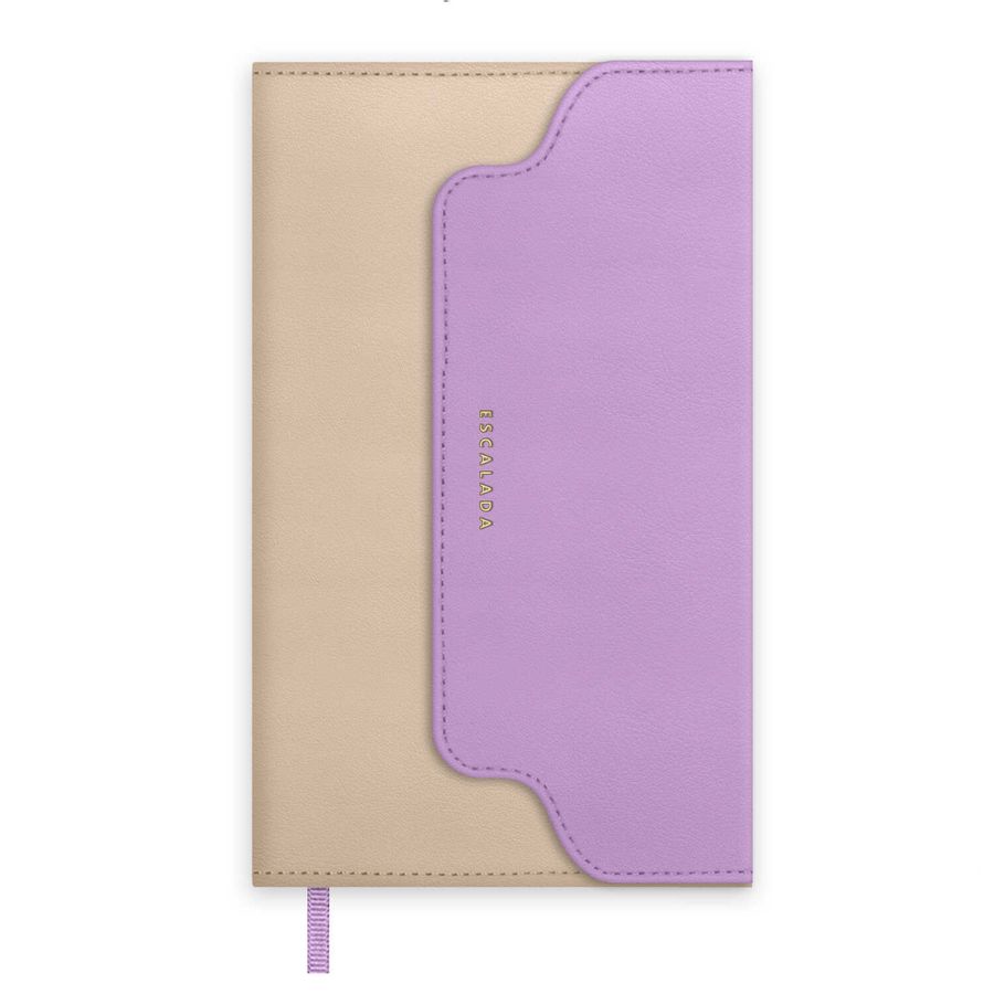 Ежедневник недатированный ESCALADA, А6+, 120 л., арт. 70675/ 20 ПЛЕЗИР БЕЖЕВЫЙ/СИРЕНЕВЫЙ (кожзам: 110x190 мм, твёрдый переплёт, запаянный край, материал обложки: искусственная кожа "Плезир"; способ крепления блока: ниткошвейный; декор: тиснение фольгой; вн. блок: 120 л., кремовый офсет 70 г/м², печать в одну краску (линия), справочный материал: есть; перфорация углов блока: нет; отделка среза: окрашивание пантоном; закладка/-и: одно ляссе, каптал: есть; форзац: печать пантоном, тиснение фольгой, особенности: комбинированные материалы, магнитный клапан; персонализация возможна: да; индивидуальная упаковка: ПЭТ-пакет)