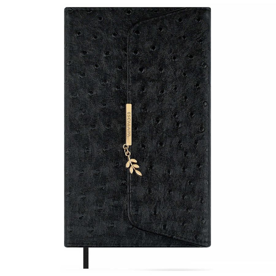 Ежедневник недатированный ESCALADA, А5, 160 л., арт. 70668/ 15 СТРАУС ЧЁРНЫЙ (кожзам: 126х211 мм, твёрдый переплёт, материал обложки: искусственная кожа "Страус"; способ крепления блока: ниткошвейный; декор: металлический шильд с декоративной металлической фигуркой; вн. блок: 160 л., кремовый офсет 70 г/м², печать в одну краску (линия), справочный материал: есть; перфорация углов блока: нет; отделка среза: окрашивание пантоном; закладка/-и: одно ляссе, каптал: есть; форзац: печать пантоном, тиснение фольгой, особенности: карман-уголок внутренний, магнитный клапан; персонализация возможна: да; индивидуальная упаковка: ПЭТ-пакет)