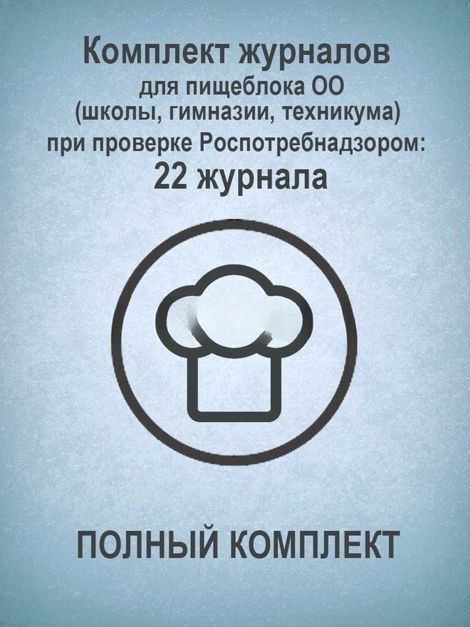 Комплект включает в себя: Санитарный журнал Журнал учёта присвоения группы 1 по электробезопасности неэлектротехническому персоналу Журнал закладки продуктов на пищеблоке Журнал бракеража скоропортящейся пищевой продукции: СанПиН 2.3/2.4.3590-20 (104 стр.) Журнал бракеража готовой пищевой продукции: СанПиН 2.3/2.4.3590-20 (200 стр.) Журнал отбора проб на пищеблоке Журнал здоровья Журнал учёта температурного режима холодильного оборудования: СанПиН 2.3/2.4.3590-20 Журнал проведения витаминизации третьих и сладких блюд Журнал-график проведения генеральных уборок Журнал визуального производственного контроля санитарно-технического состояния и санитарного содержания помещений Журнал регистрации результатов профессиональной гигиенической подготовки и аттестации должностных лиц и работников организаций Журнал учёта проверок юридического лица, индивидуального предпринимателя, проводимых органами государственного контроля (надзора), органами муниципального контроля Журнал регистрации аварийных ситуаций (отказов и неисправностей инженерного оборудования) и учёта работы по их устранению Журнал учета остатков готовой продукции Журнал инструктажа по предупреждению попадания посторонних предметов в продукцию Журнал входного контроля пищевых продуктов, продовольственного сырья Журнал учета использования фритюрных жиров Журнал учета работ по проведению очистки и дезинфекции систем вентиляции и кондиционирования воздуха на объекте Журнал учета дезинфекции, дезинсекции и дератизации Журнал контроля концентраций рабочих растворов дезинфицирующих и стерилизующих средств Журнал осмотра рук и открытых частей тела на наличие гнойничковых заболеваний и других нарушений кожного покрова
