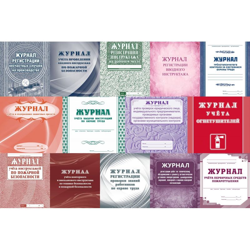 В комплект входит: Журнал регистрации инструктажа на рабочем месте Журнал учёта противопожарных инструктажей Журнал регистрации вводного инструктажа Журнал учёта первичных средств пожаротушения Журнал трехступенчатого контроля за состоянием охраны труда Журнал учёта выдачи инструкций по охране труда Журнал учёта огнетушителей Журнал регистрации несчастных случаев на производстве Журнал учёта проверок юридического лица, индивидуального предпринимателя, проводимых органами государственного контроля (надзора), органами муниципального контроля Журнал учёта и содержания защитных средств: (Формат 60х84/8, бл. писчая, обл. мелованный картон, 48 с.) Журнал регистрации работ по техническому обслуживанию и ремонту автоматических установок пожаротушения, дымоудаления, охранной, пожарной и охранно-пожарной сигнализации: 32 с. Журнал учёта повторного и внепланового инструктажа по технике безопасности и пожарной безопасности Журнал регистрации протоколов проверки знания требований охраны труда работников Журнал учета проведения вводного инструктажа по пожарной безопасности