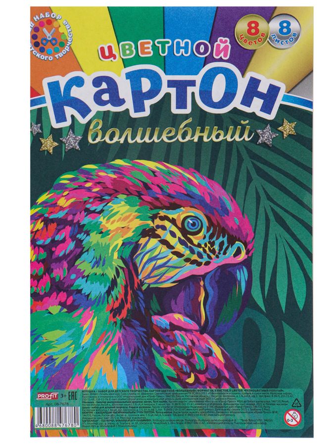 Цветной картон формата А4 идеально подойдет для детского творчества! С его помощью можно создать красивые аппликации и объёмные поделки. Картон плотный, поэтому на нём можно рисовать фломастерами или красками. В набор входит 8 листов: 6 основных цветов и 2 металлизированных листа золотого и серебряного цветов. Скреплены методом клеевого бесшвейного скрепления (КБС).