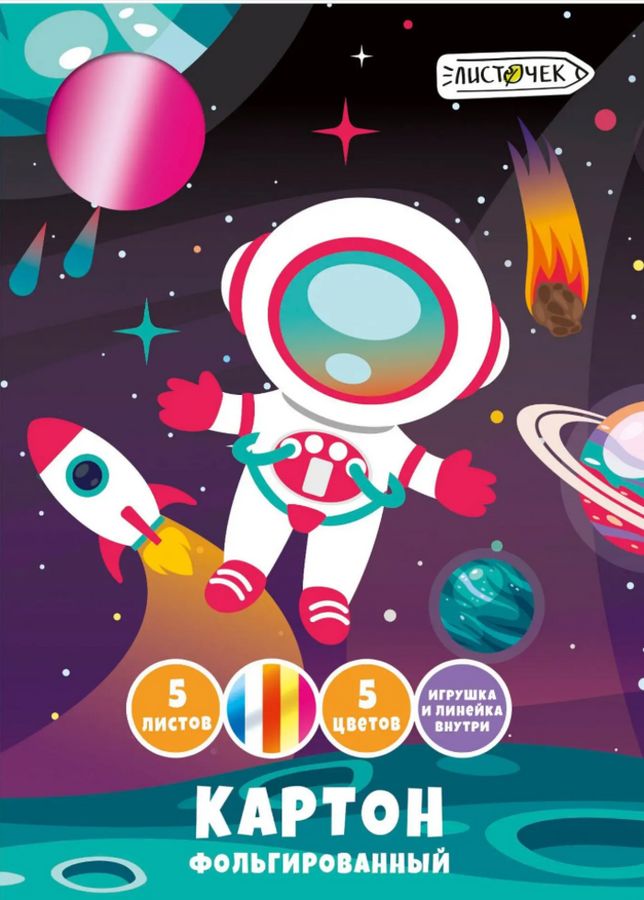 Набор цветного фольгированного картона от Эксмо. предназначен для детского творчества.Станет помощником в создании красочных поделок и аппликаций.Картон легко режется ножницами, сгибается и клеится. Внутренний блок состоит из 5 листов формата А4 (205х290 мм) и 5 цветов.