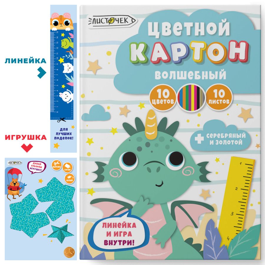 Картон цветной А4 10л 10цв мелованный волшебный Дракоша в папке ЛИСТОЧЕК ВКЦ1010683