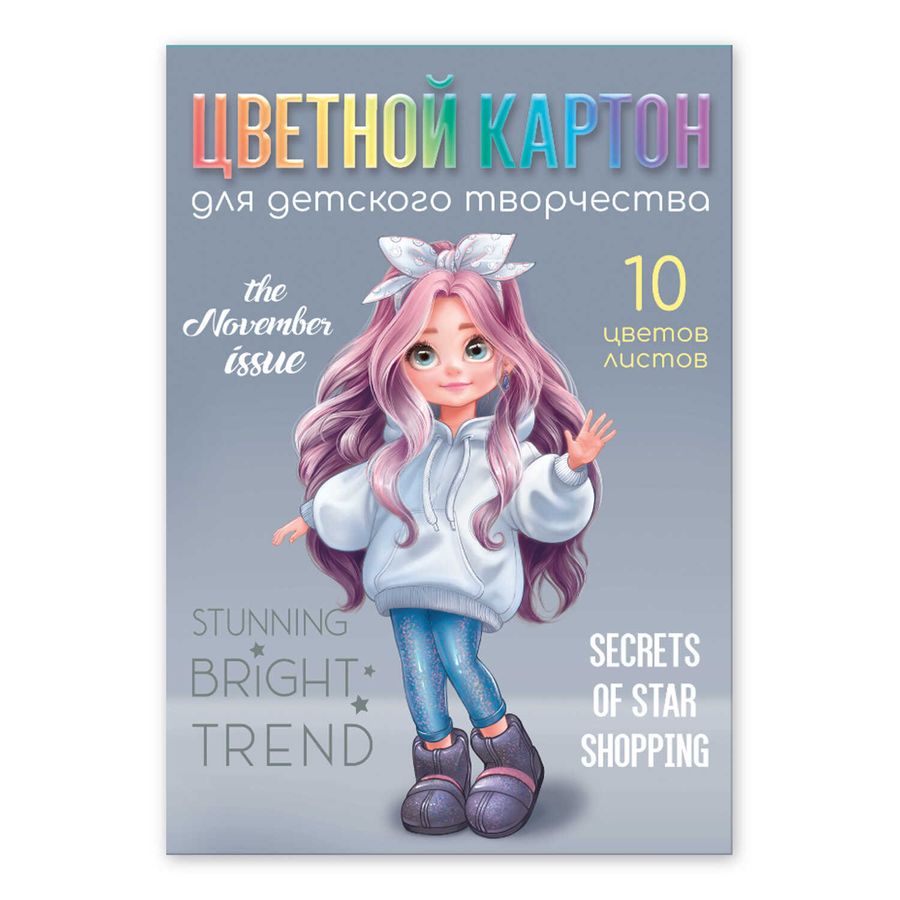 Цветной картон арт. 69971 МИЛАШКА /А4, клеевое скрепление, 10 л, обложка - полноцветная печать, мелованный картон с серым оборотом 230 г/м², блок - мелованный картон с белым оборотом, 200 г/м², 10 цветов, односторонняя печать