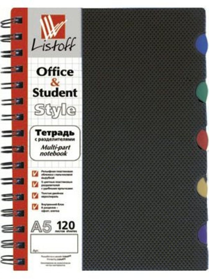 Тетрадь А5(155х210 мм), 120л. 5цв. пласт. раздел., вн. бл. 6 разд. Обложка рельеф. пласт. с пальчиковой выруб. Оф.70 г/м2, клетка, в инд. пласт.пакете
