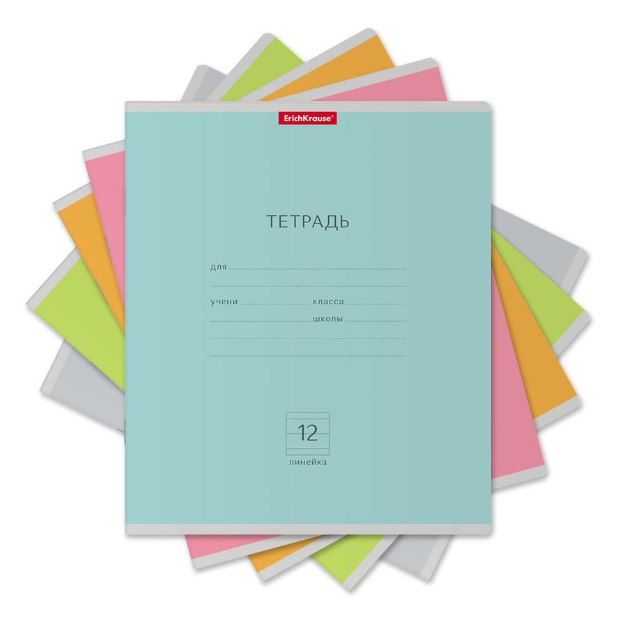 Тетрадь школьная ученическая формата А5+ (170х203 мм). Обложка из высококачественного мелованного картона плотностью 180 г/м2. В блоке 12 листов в линейку с полями. Бумага офсетная плотностью 60 г/м2. Цвет линовки - синий. Скругленные уголки обложки и блока. Тип скрепления - скоба. Тетради разных цветов упакованы в термоусадочную пленку по 10 штук.