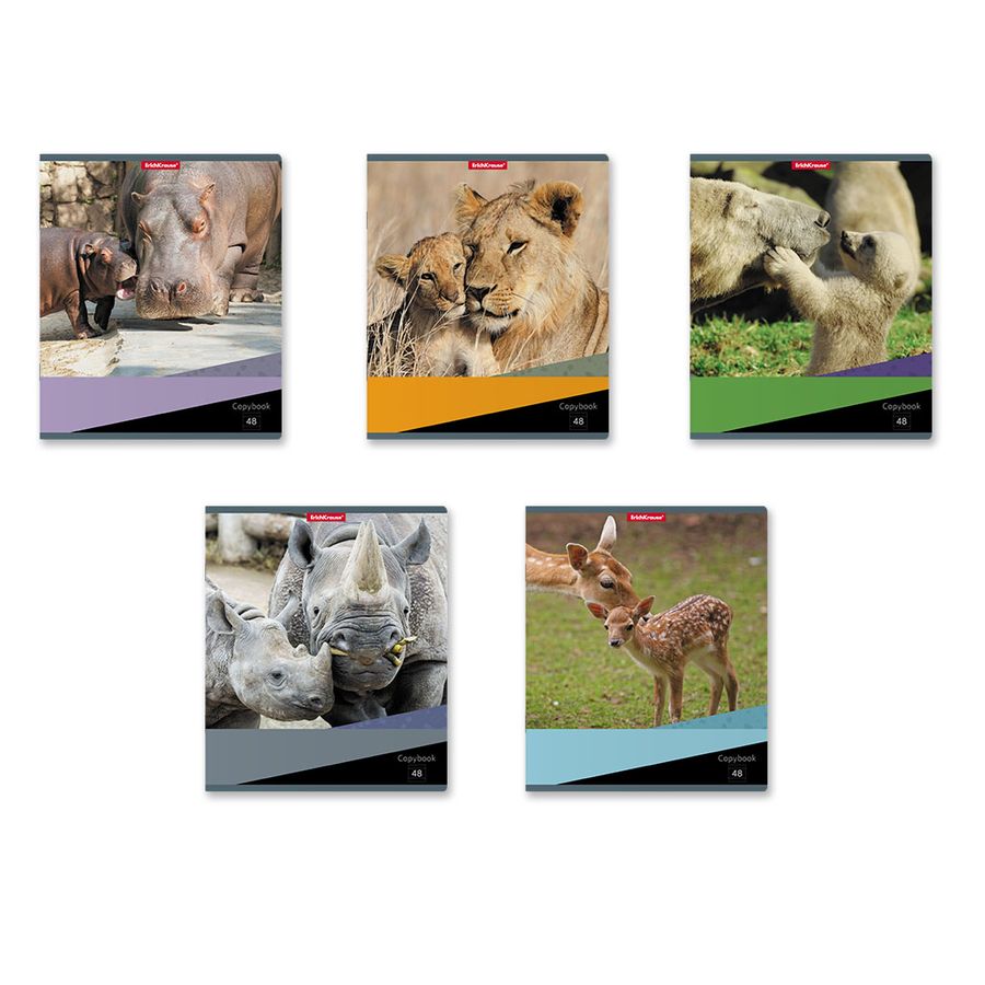 Тетрадь общая формата А5+ (170х203 мм). Обложка из высококачественного мелованного картона плотностью 190 г/м2. В блоке 48 листов в линейку с полями. Бумага офсетная плотностью 60 г/м2. Цвет линовки - синий. Скругленные уголки обложки и блока. Тип скрепления - скоба. Тетради одного дизайна упакованы в термоусадочную пленку по 5 штук. Товар поставляется в нескольких вариантах дизайна без возможности выбора.