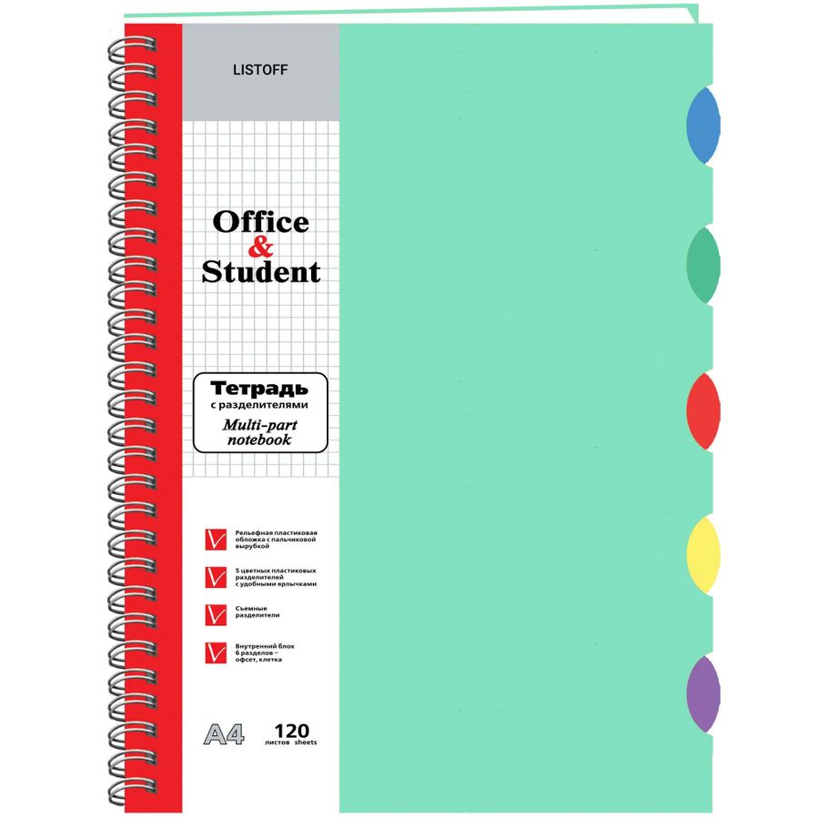 Тетрадь А4 120л клетка гребень пласт.обл. Однотон Мятный 5цв.пласт.раздел. Listoff ТПР412076