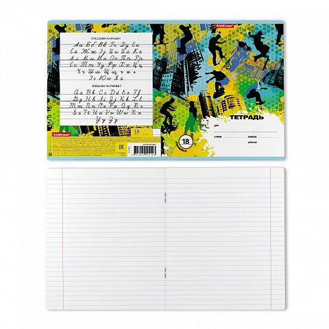 Тетрадь школьная ученическая формата А5+ (170х203 мм). Обложка из высококачественного мелованного картона плотностью 180 г/м2. В блоке 18 листов в линейку с полями. Бумага офсетная плотностью 60 г/м2. Цвет линовки - синий. Скругленные уголки обложки и блока. Тип скрепления - скоба.