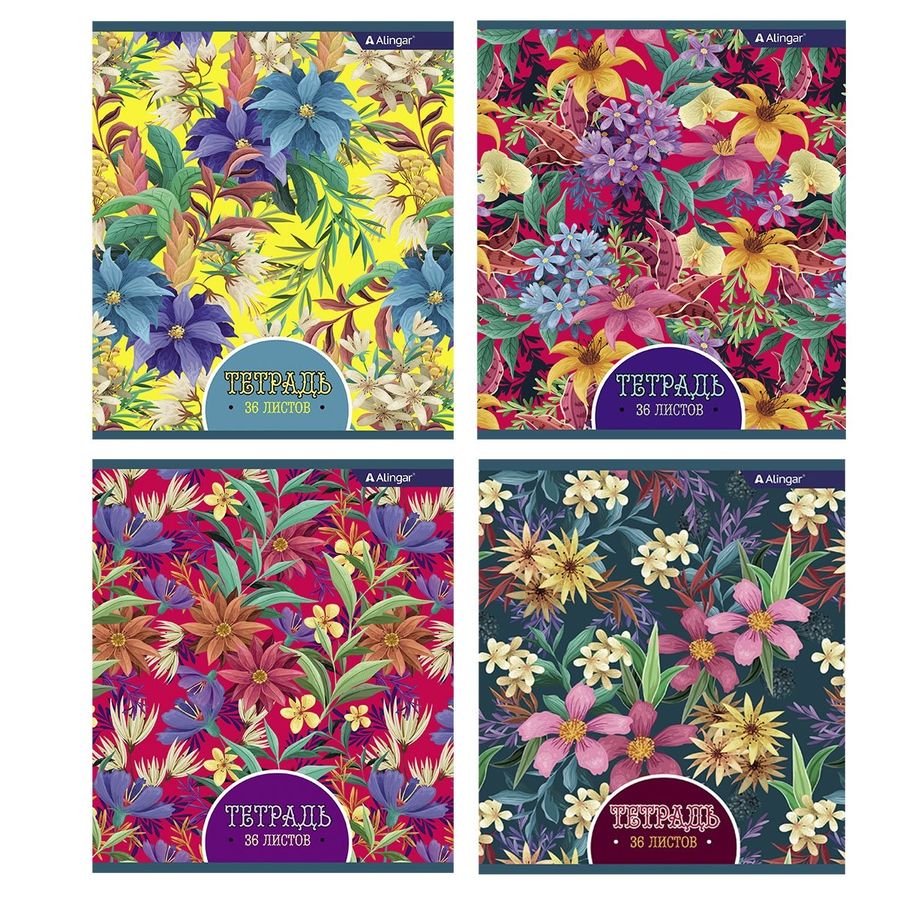 Тетрадь А5 36л линия Яркие цветы мелов.картон ассорти 4диз. ALINGAR AL7932