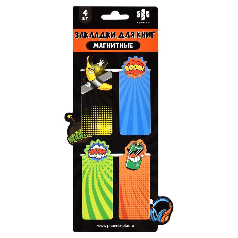 Набор закладок магнитных для книг арт. 65049/К / 100 СТРИТ-АРТ (4 шт. в наборе, размер 30x60 мм, материал: ПВХ, ферроагломерированный полимер; цвет: зелёный, оранжевый, синий, чёрный, декор: полноцветный дизайн, фигурная вырубка, особенности: глянцевая ламинация, индивидуальная упаковка: подложка с европодвесом из мелованного картона + ПЭТ-пакет)