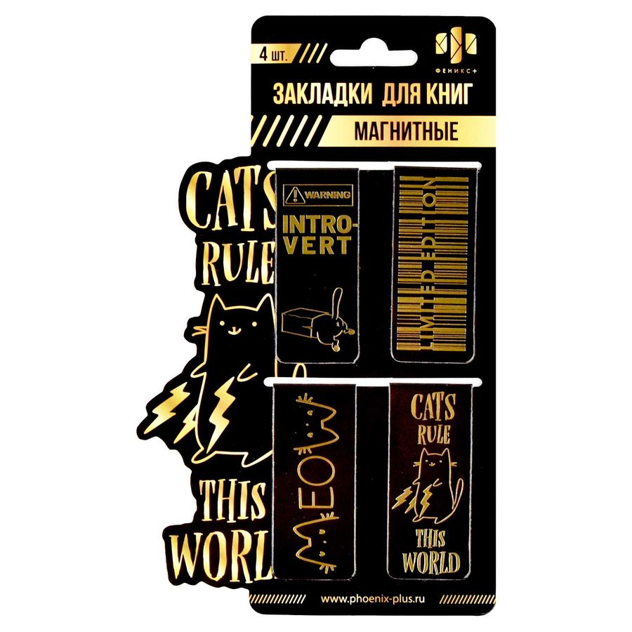 Набор закладок магнитных для книг арт. 67831 / 100 КОТЫ ПРАВЯТ МИРОМ (4 шт. в наборе, размер 25х58 мм, материал: мелованная бумага, ферроагломерированный полимер; цвет: бежевый, бронзовый, жёлтый, золотистый, золотой, чёрный, декор: полноцветный дизайн, тиснение фольгой, особенности: глянцевая ламинация, индивидуальная упаковка: подложка с европодвесом из мелованного картона + ПЭТ-пакет)