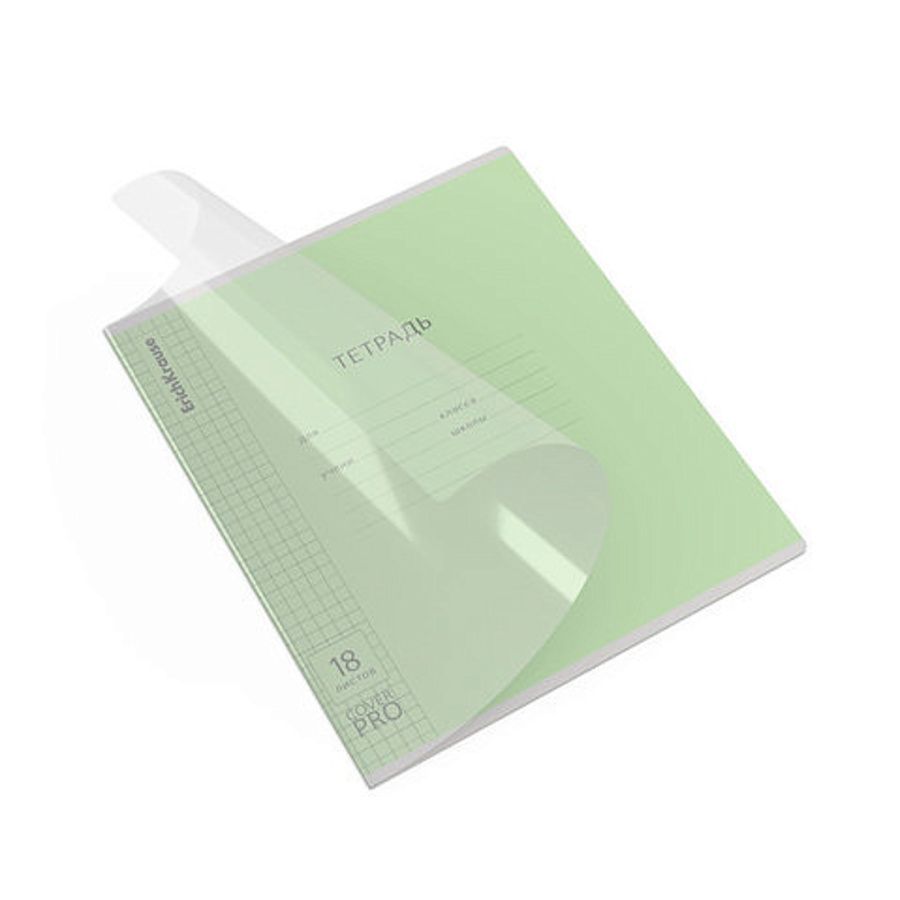 Тетрадь школьная ученическая формата А5+ (170x203 мм). Двойная обложка: внешняя выполнена из высококачественного износостойкого прозрачного пластика с фактурой «апельсиновая корка», внутренняя — из качественной мелованной бумаги. В блоке 18 листов в клетку. Бумага офсетная плотностью 60 г/м2. Цвет линовки — синий. Скругленные уголки обложки и блока. Тип скрепления — скоба.