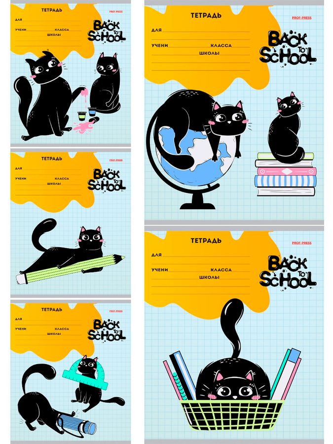 Тетрадь А5 24л клетка скрепка обл.мелов.бум. Котик и школьная тема ассорти 5диз. PROF-PRESS 24-5796