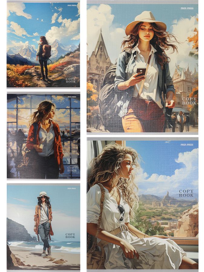 Тетрадь А5 48л клетка скрепка мелов.картон Девушки-путешественницы лен ассорти PROF-PRESS 48-5134
