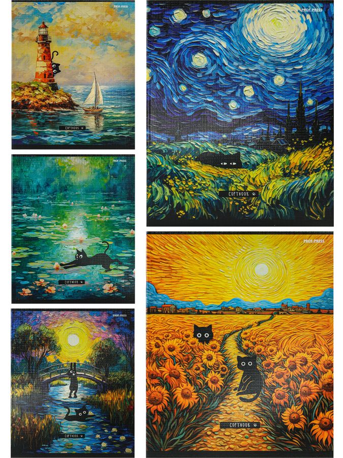 Тетрадь А5 48л клетка скрепка мелов.картон Коты и искусство лен ассорти PROF-PRESS 48-7094